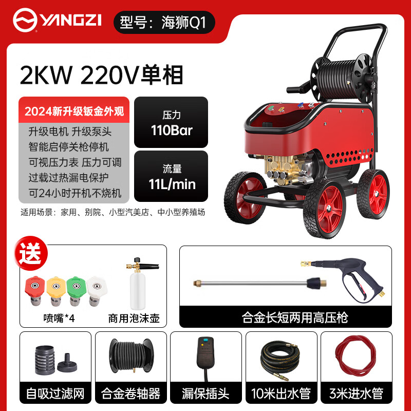 揚(yáng)子海獅洗車機(jī)商用洗車高壓洗車機(jī)洗車店養(yǎng)殖場(chǎng)220V大功率高壓清洗機(jī),商用曲軸泵,專用精鍛泵頭,不銹鋼噴瓷柱塞,9股鋼絲編織高壓管,可承受200KG壓力。